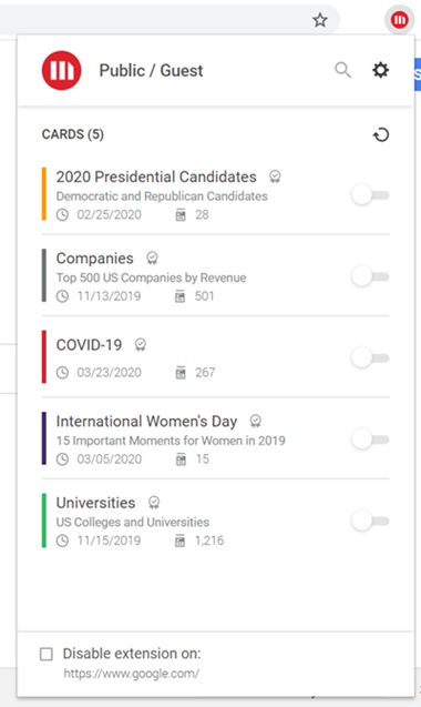 HyperIntelligence for Web 拡張機能では、どのカードを有効にするか無効にするか、また特定の Web ページに対して HyperIntelligence を無効にするかどうかを選択できます。付与された権限に基づき、ユーザーは接続済みの環境に基づいてカードにアクセスします。
