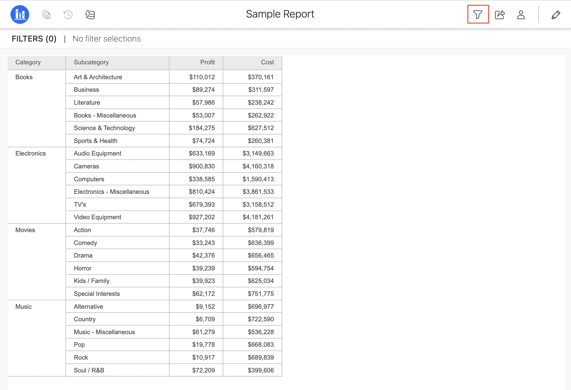 When you execute the report for consumption, you see a Filter icon.