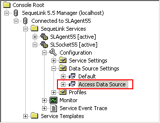 - En Raíz de consola, ir a SequeLink 6.0 Manager > Conectado a SLAgent55 > Servicios de SequeLink > SLSocket55 > Configuración > Configuración del origen de datos.
