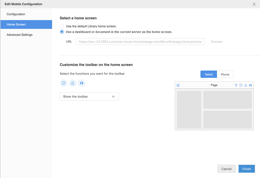 https://env-123456.customer.cloud.microstrategy.com/MicroStrategyLibrary/admin. - Ir a Configuración móvil.