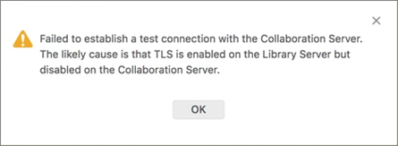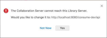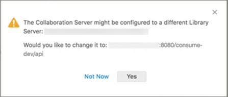 Esto es solo una advertencia: el servidor de Colaboración está hablando con otro servidor de Library. Está permitido usar el servidor de Library actual. Pueden surgir problemas potenciales cuando los dos servidores de Library proporcionen datos diferentes.