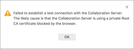 El servidor de colaboración se ejecuta con TLS habilitado pero utiliza un certificado firmado por una CA raíz privada. Algunos navegadores considerarán que dichas CA raíz privadas no son de confianza y bloquearán las solicitudes a esos servidores. Es posible que el administrador necesite agregar esas CA raíz privadas a la lista de confianza.