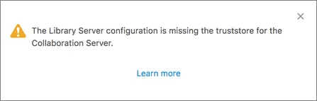 Si el servidor de Colaboración se ejecuta con TLS habilitado y utiliza un certificado privado raíz firmado por una CA, el servidor de Library deberá presentar el certificado correspondiente para establecer una comunicación segura. El administrador puede configurar un archivo de almacén de confianza en el servidor de Library (consulte Propiedades de configuración de MicroStrategy Library Server). Si no se hace referencia al certificado requerido en el almacén de confianza, se generará esta advertencia. Con esta advertencia activa, el servidor de Library no puede comunicarse con el servidor de Colaboración. Funcionalidades como la actualización de la configuración del servidor de Colaboración en el panel de control de Administración de Library fallarán. Está permitido utilizar el servidor de Library.