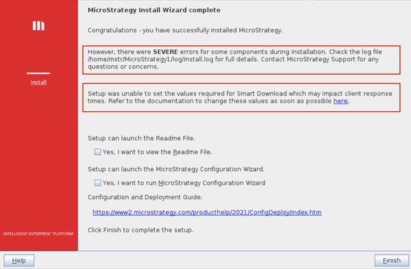 Cuando la instalación haya finalizado, puede que aparezca el siguiente mensaje. Esto ocurre cuando un usuario que no es root ejecuta el instalador. En este caso, el instalador no tiene permiso para aumentar el límite a nivel de usuarios o la nice límite, necesario para dar prioridad a las solicitudes interactivas y con factores de tiempo limitado que llegan al Intelligence Server. Esta priorización forma parte de los mecanismos de control automático de Intelligence Server que ayudan a mantener el rendimiento del tiempo de respuesta bajo cargas intensas. Para obtener más información sobre el nice límite para el orden de prioridades y cómo aplicar manualmente el límite, consulte esto Página.