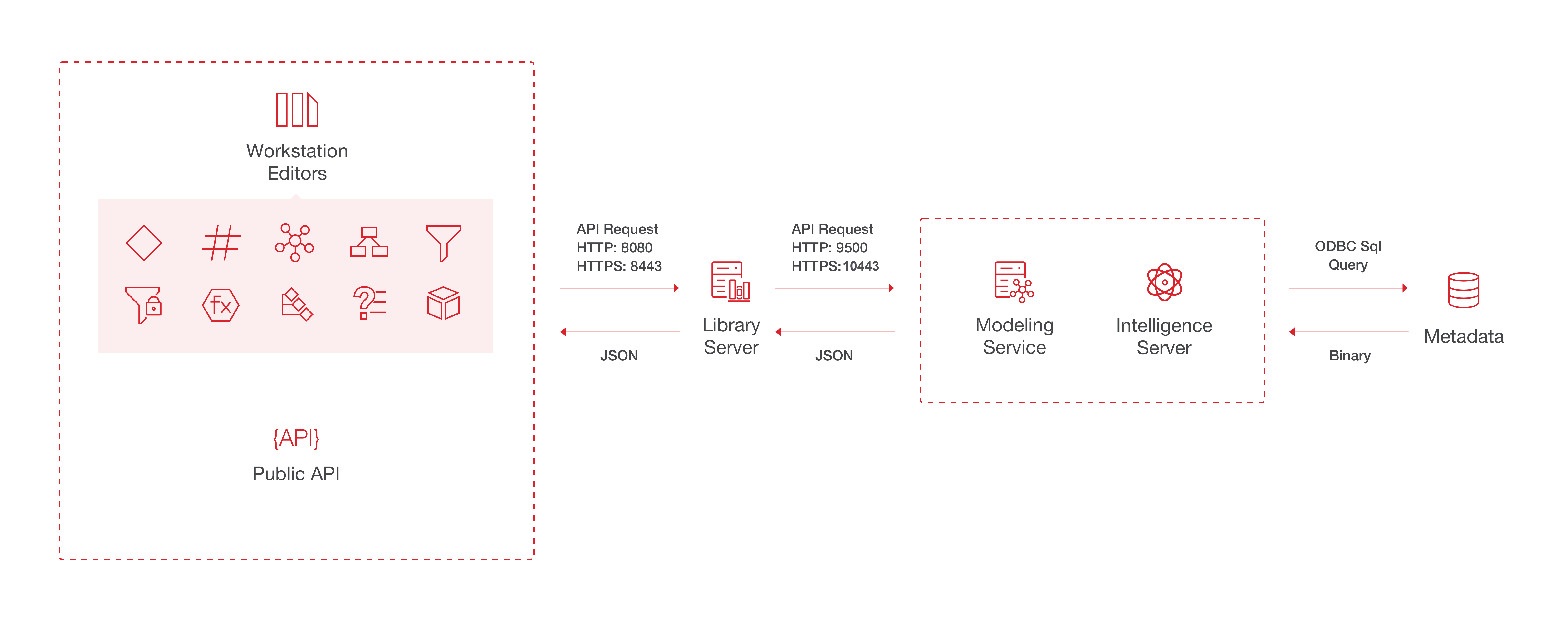 - Intelligence Server: proporciona y guarda la definición de objeto e interactúa con los metadatos para recuperar la información relevante. El servidor Intelligence también contiene la lógica para bloquear y desbloquear el esquema. La respuesta del servidor de Intelligence al servicio de modelado está en formato JSON.