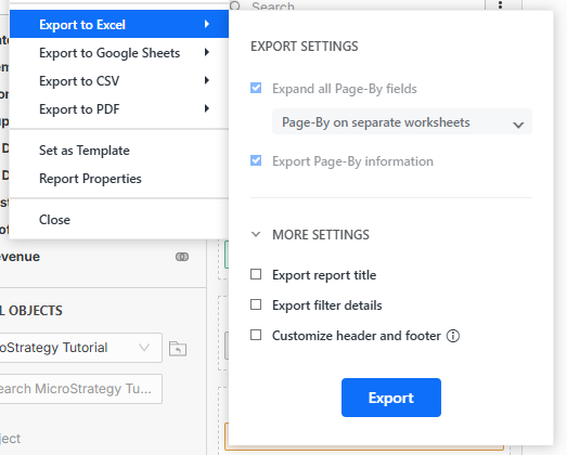 Starting in Strategy One (April 2026), you can export not only from Presentation View but also from Design Mode without having to save the changes first. This new functionality enables analysts to make changes to the report and export it for further distribution without impacting the report design.
