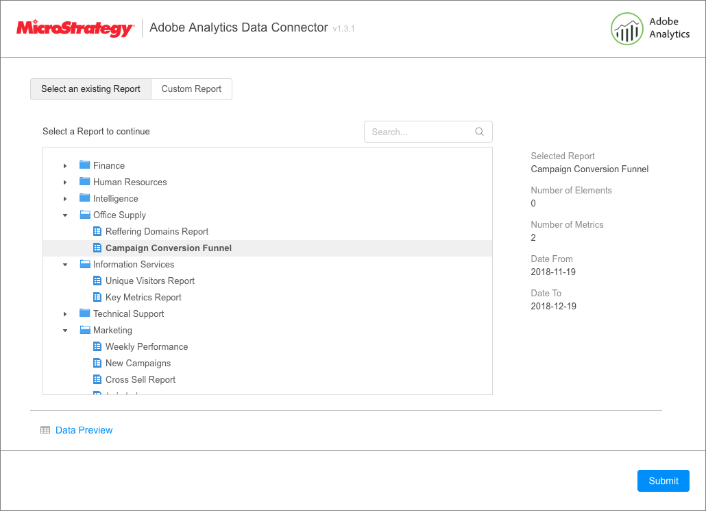 À partir de MicroStrategy ONE Update 12, vous pouvez utiliser Adobe Analytics comme partie de nouvelle expérience d'importation de données. Si vous utilisez une version antérieure à MicroStrategy ONE Update 12, reportez-vous à Utiliser le connecteur Adobe Analytics avant de MicroStrategy ONE Mise à jour 12.