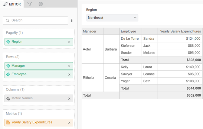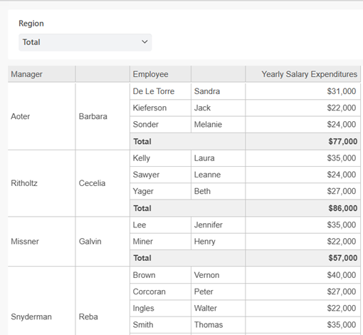 예를 들어, 아래 리포트는 지역, 관리자 및 직원별 급여 비용을 표시합니다. 지역(Region)을 페이지-바이 영역에 배치하고 한 번에 한 지역씩 관리자(Manager) 및 직원(Employee)별로 급여 지출 데이터를 볼 수 있습니다. 리포트의 모든 데이터는 계속 존재하지만 더 작고 관리하기 쉬운 섹션으로 그룹화되어 있습니다.