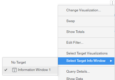 캔버스 내부 필터 및 시각화를 정보 창 소스 시각화를 대상으로 하는 필터로 전달하려면 정보 창을 마우스 오른쪽 버튼으로 클릭 > 추가 필터 조건 적용 .