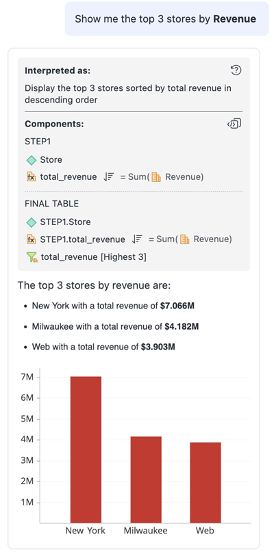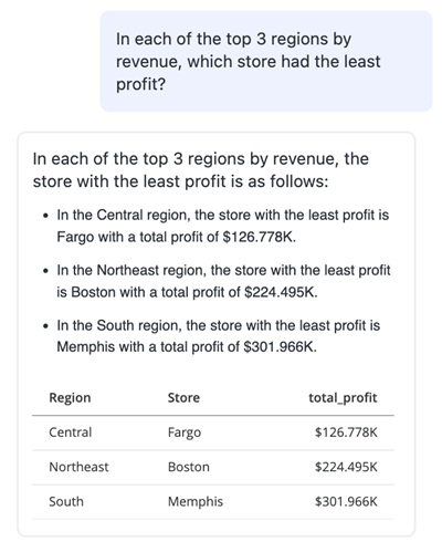 MicroStrategy ONE (2024년 3월)부터 대시보드의 여러 데이터세트에 걸친 복합적이고 다면적인 질문에 대한 유효한 응답을 받을 수 있습니다. 예를 들어, "수익 기준 상위 3개 지역 각각에서 수익이 가장 적은 상점은 무엇입니까?"와 같은 질문을 할 수 있습니다. 이 업데이트를 사용하면 동일한 질문 내 여러 데이터 포인트에서 끌어와 상황에 맞는 보다 심층적인 인사이트를 얻을 수 있습니다. 이전 예에서 자동 응답은 수익 증가가 가장 높은 3개의 지역을 계산한 다음 각 지역에서 가장 수익이 낮은 개별 상점을 식별합니다. 그런 다음 자동 응답은 이전 단계의 응답을 결합하여 최종 응답을 표시합니다.