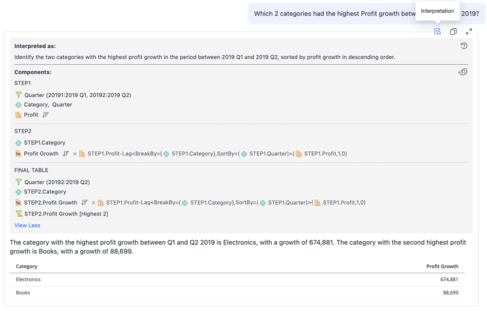 "2019년 1분기와 2분기 사이에 수익 증가가 가장 높은 2개의 범주는 무엇입니까?"라는 질문을 고려해 보십시오. 이 질문은 여러 계층으로 진행됩니다. 처음에 자동 응답은 두 분기에 대한 모든 범주의 수익을 정확하게 파악한 다음 증분을 계산하고 마지막으로 순위를 지정하여 상위 2개의 범주를 식별합니다. 이 방법은 다단계 실행이 설명되는 해석 창을 확장할 때 모든 질문에 대해 더 잘 이해됩니다.