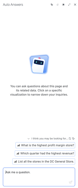 자동 응답이 응답하면 관련 아이콘을 클릭하여 시각화를 전체 화면으로 최대화하거나 응답을 클립보드에 복사할 수 있습니다.
