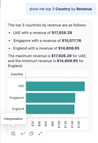 MicroStrategy ONE (2024년 3월)부터 다음을 사용할 수 있습니다. 해석자동 응답을 질문을 해석하고 실행한 방법에 대한 통찰력은 자동 응답에서 확인하십시오. 해석 창에 표시되는 정보의 범위는 사용자 권한에 따라 달라집니다.