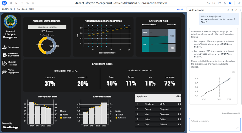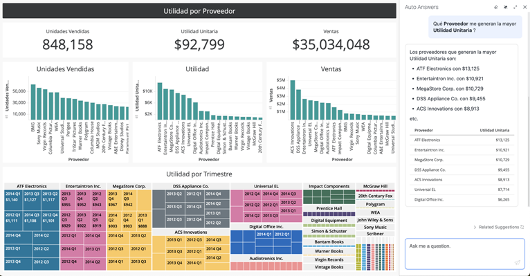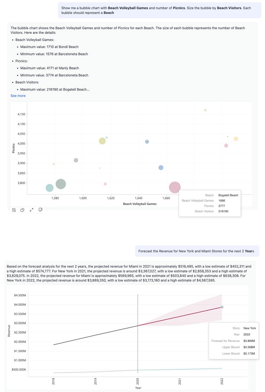 현재 대시보드 페이지 및 관련 데이터에 대한 자동 응답 질문을 하기만 하면 됩니다. 직접 질문하기또는 권장 분석 중 하나를 활용할 수 있습니다. 대시보드 페이지에서 시각화를 클릭하여 분석을 추가로 사용자 정의합니다. 이렇게 하면 범위가 축소되어 자동 응답이 전체 페이지의 데이터를 고려하는 대신 해당 특정 시각화 내의 데이터에만 초점을 맞출 수 있습니다. 자동 응답은 분석 유형 및 데이터 양에 따라 데이터 포인트, 요약, 다양한 시각화 또는 상황별 대화로 요청에 응답합니다.