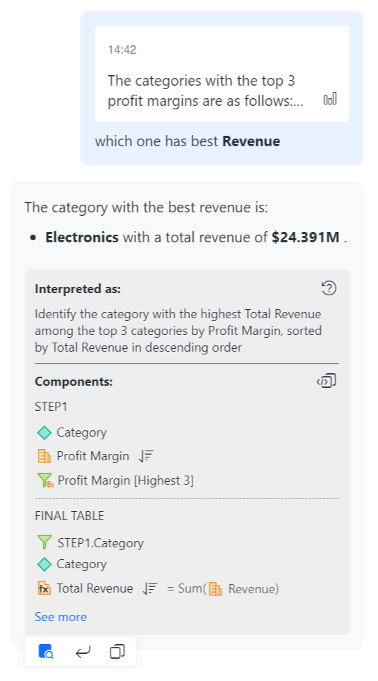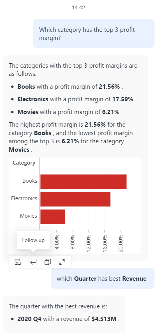 MicroStrategy ONE (2024년 9월)부터 비즈니스 사용자는 이전 응답에 후속 조치를 취할 수 있으며, 자동으로 원래 응답의 컨텍스트를 유지하여 후속 질문에 효과적으로 해결하기 위해 노력합니다.