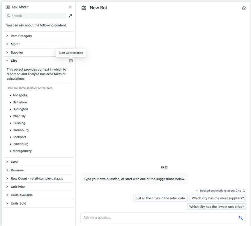 을(를) 클릭합니다. 봇의 데이터세트에 대한 세부 사항과 함께 질문하기 패널이 표시됩니다. - 개체가 애트리뷰트인 경우 개체를 확장하여 개체 설명과 샘플 데이터를 표시할 수 있습니다.