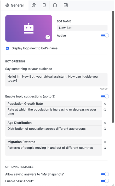 사용일반패널을 사용해 사용자 정의할 수 있습니다. 봇의 표시 및 동작을 특정 산업 요구 사항 또는 개인 기본 설정에 맞게 조정합니다. 봇의 이름, 로고 및 인사를 변경할 수 있습니다. 주제 및 질문 제안을 제공합니다. 응답, 봇의 데이터세트 개체에 대한 정보 및 해석을 저장하도록 활성화합니다.
