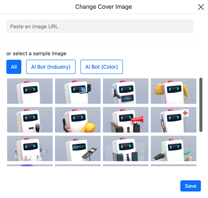 을(를) 클릭하여 Library에 표시되는 표지 이미지를 변경합니다. 샘플 이미지 중 하나를 선택하거나 URL을 붙여넣고 을(를) 클릭할 수 있습니다. 저장 .