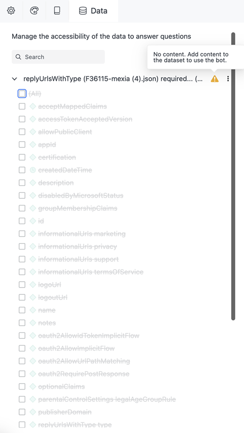 봇 데이터세트에 있는 모든 개체가 제외되면 봇에 응답을 소싱할 데이터가 없기 때문에 오류가 표시됩니다. 봇이 활성화되려면 1개 이상의 개체가 선택되어야 합니다.