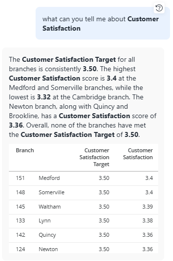 개방형 질문으로 해석되는 "고객 만족도에 대해 무엇을 할 수 있습니까?" 하나 이상의 관심 관련 정보를 표시하려고 합니다. 설명은 평균 고객 만족도 포인트와 최고 및 최저 포인트를 지닌 분기를 제공합니다. 또한 대상을 충족하지 않은 분기가 없음을 나타냅니다. 그리드에는 분기별로 모든 포인트와 대상이 표시됩니다.