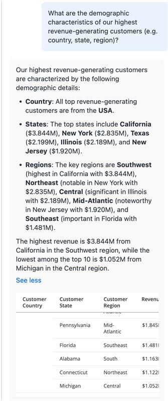 아래에는 메트릭 대신 애트리뷰트를 사용하여 개방형 질문의 다른 예가 나와 있습니다. 질문은 "가장 높은 수익을 창출하는 고객의 인구통계적 특성(예: 국가, 주, 지역)은 무엇입니까?"입니다.