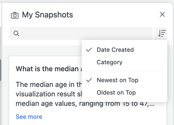 파일 상단에 있는 검색 상자를 사용합니다. 내 스냅샷 패널을(를) 클릭하여 메시지를 검색합니다. 키워드는 질문 또는 응답 요약을 일치시키는 데 사용됩니다. 키워드는 시각화에서 데이터를 검색하는 데 사용되지 않습니다.