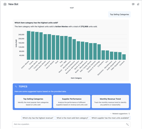 MicroStrategy ONE 에서 시작 (2024년 3월)부터 봇에서 제안 주제를 사용할 수 있습니다. 주제 제안이 활성화되면 봇은 봇의 데이터세트에 따라 주제 제안을 자동으로 생성합니다. 봇 Designer는 사용자 정의 주제 제안을 생성할 수도 있습니다.
