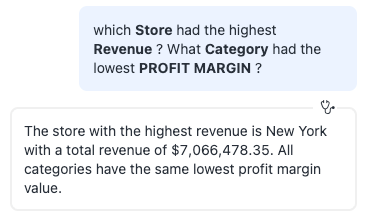 예를 들어, "가장 높은 수익을 창출한 상점과, 어떤 제품 범주가 가장 낮은 수익을 냈습니까?"를 질문하는 경우 자동 응답이 최고 수익 상점을 정확하게 식별할 수 있지만, 수익은 해결하지 않을 수 있습니다.