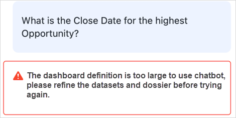 자동 응답에 질문을 제출할 때 데이터 입력 제한에 도달한 후 응답을 반환할 수 있습니다. 그런 경우 다음과 같은 응답을 받습니다. 대시보드 정의가 자동을 사용하기에 너무 큽니다. 다시 시도하기 전에 데이터 세트 및 대시보드를 수정하십시오.