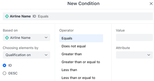을(를) 사용하여 두 조건을 함께 평가하십시오. 아래 이미지에서 정시 요금 조건은 항공사 이름 조건 및 공항 조건으로 구성된 그룹에 AND 연산자를 사용하여 조인되며 역시 AND 연산자로 조인됩니다.