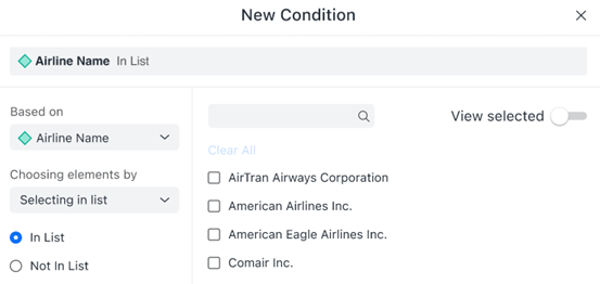 애트리뷰트의 경우 기본적으로 해당 값(애트리뷰트 요소)은 목록의 애트리뷰트 요소와 비교됩니다. 선택목록에 있음또는목록에 없음 . 비교할 요소의 확인란을 선택합니다.