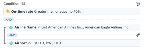 3개 이상의 조건을 추가하는 경우 특정 조건을 그룹화할 수 있습니다. 예를 들어, 특정 항공사가 I AD, BWE 또는 DCA 공항에서 출발하고 정시 요금이 70%보다 큰 경우 구독을 전송해야 합니다. 클릭그룹