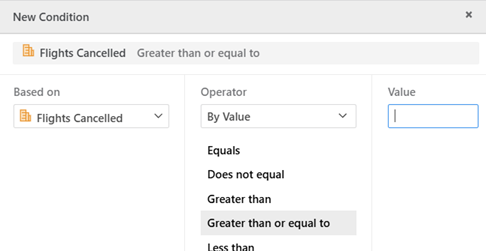 취소된 항공편 수가 100보다 큰 등의 알림 조건을 정의합니다.
