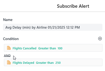 여러 조건을 추가하는 경우 조건을 조인하는 연산자를 변경할 수 있습니다. 기본적으로 모든 조건은 AND 연산자로 조인됩니다. 즉, 알림 구독을 트리거하려면 데이터가 모든 조건을 충족해야 합니다. 연산자를 변경하려면 을(를) 클릭합니다. AND및 선택또는 , AND NOT , 또는 OR NOT .
