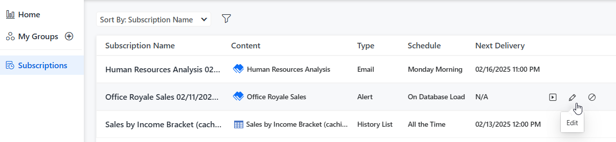 아래에 표시된 구독 패널에는 Office 왕실 영업 대시보드에 대한 새로운 알림 구독이 Human Resources Analysis 대시보드의 구독 및 수익 괄호별 판매 리포트의 사용 내역 목록 구독과 함께 나열됩니다. 각 구독을 실행, 편집 또는 구독 취소할 수 있습니다.