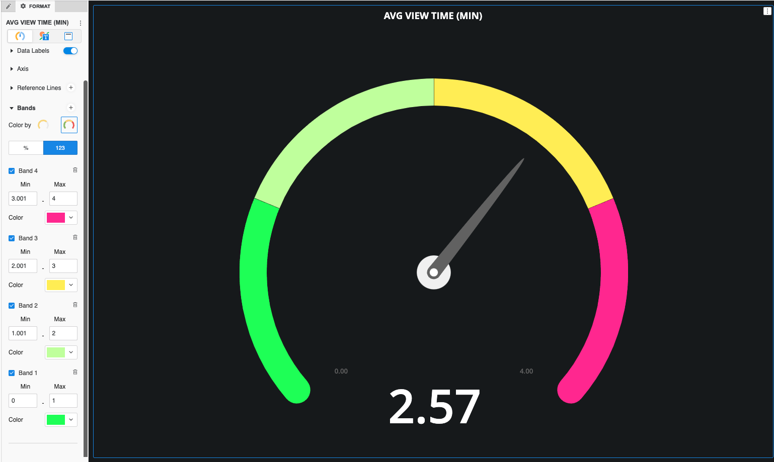5. 디자인에 원형 또는 사각형 가장자리 중에서 선택하고 바늘을 표시하고 색상을 일치시켜 모양과필을 제어합니다. 시각화의 메트릭 또는 상수 값을 사용하여 축 범위를 제어할 수도 있습니다. 참조 선을 추가하고 표시를 제어합니다.