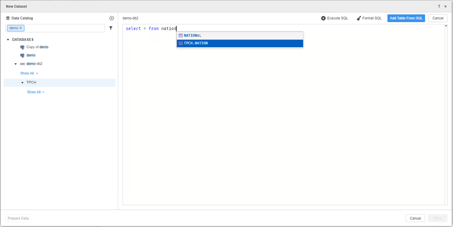 - Freeform SQL을 사용하는 경우 모드에서는 테이블을 추가하는 드래그 앤 드롭 기능을 사용할 수 없습니다. 테이블을 추가하려면 작업 공간에 쿼리를 수동으로 입력해야 합니다. 쿼리를 입력하는 동안 테이블이 자동 완료되도록 활성화하려면 연결을 설정하고 네임스페이스를 선택해야 합니다. 따옴표 또는 각 괄호와 같은 특정 문장 부호는 자동 완성 프로세스에 포함되지 않습니다.