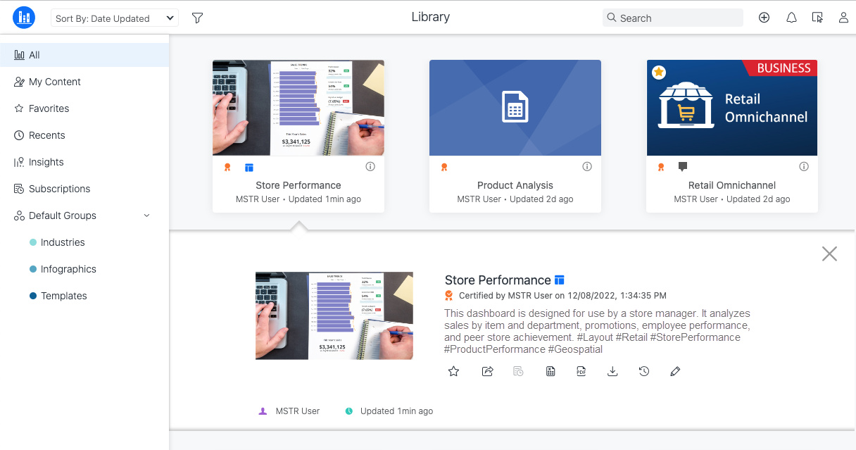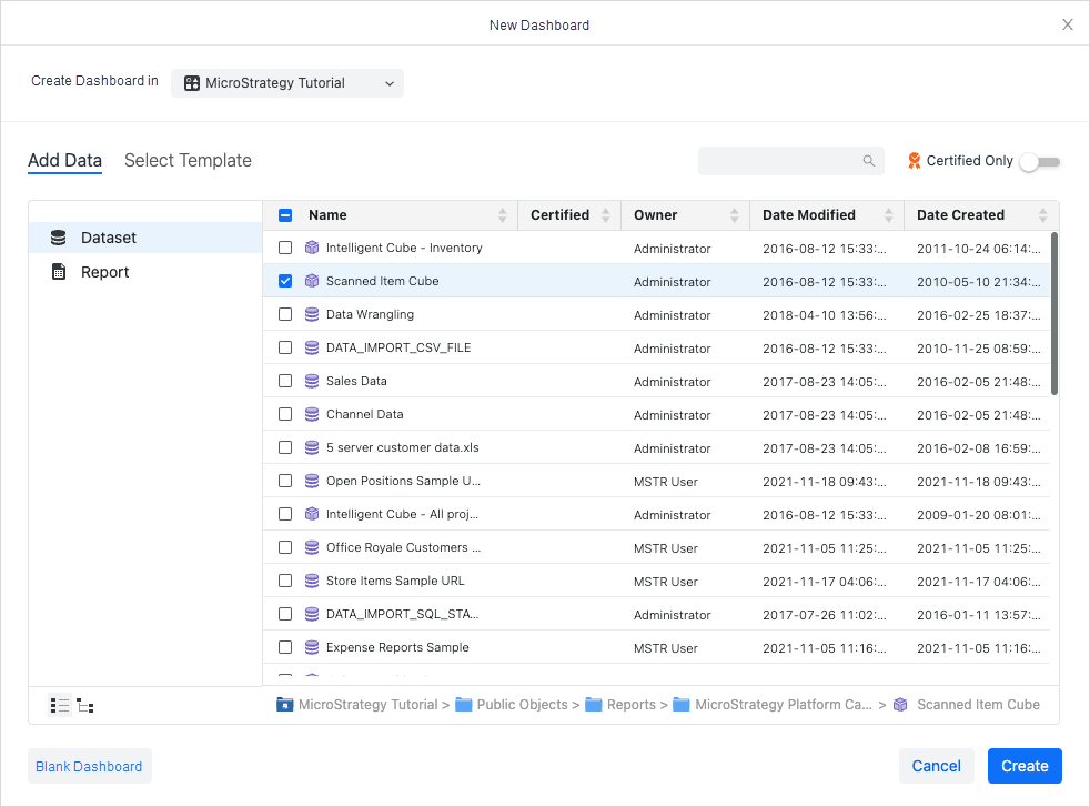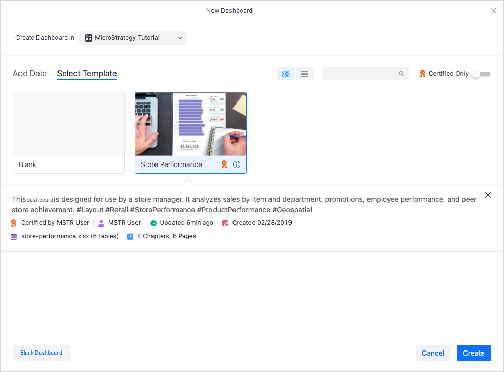 MicroStrategy 2021 업데이트 8부터 애플리케이션 아키텍트는 모든 대시보드를 템플릿으로 정의할 수 있습니다. 또한 Workstation을 사용하여 관리자 또는 아키텍트는 템플릿을 프로젝트에 대한 기본값으로 설정할 수 있습니다. 템플릿은 미리 정의된 레이아웃, 기업 로고, 표지 이미지 또는 하나 이상의 데이터 세트를 포함할 수 있으므로 콘텐츠를 생성하는 사용자에게 시작점을 제공하여 사용자를 안내하고 기업 표준을 준수할 수 있도록 합니다. 새 대시보드를 만들 때 사용자는 데이터 세트를 먼저 선택한 다음 액세스 권한이 있는 템플릿 중 하나를 선택하는 옵션을 제공하는 인터페이스가 제공됩니다.