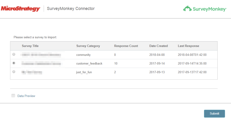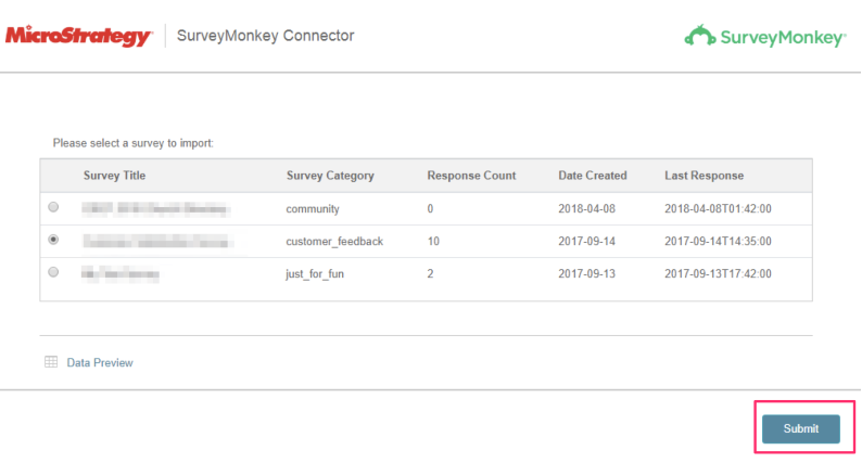 - 인증에 성공하면 설문조사 목록을 표시하는 데이터 가져오기 페이지로 리디렉션됩니다.