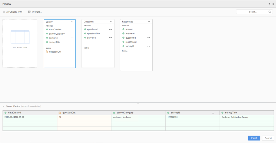 - 미리보기 대화 상자에서 데이터를 랭글하고 Finish(완료)를 클릭합니다.