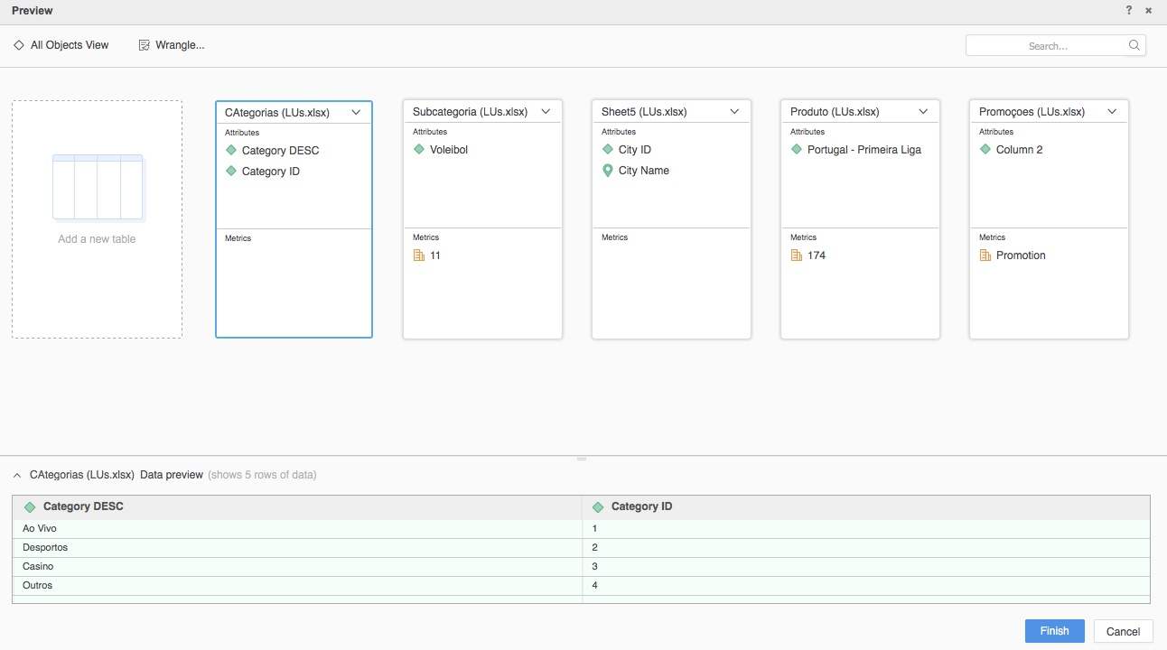 - 미리보기 대화 상자에서 데이터를 랭글하고 Finish(완료)를 클릭합니다.