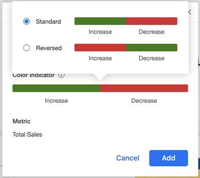 및 선택인사이트에 추가 . 각 사용자는 자신의 인사이트 페이지에 최대 30개의 KPI를 저장할 수 있습니다.이름 KPI를 확인하고 a를 선택하십시오. 색상 지표색상 막대를 클릭하여 삭제할 수 있습니다. 이는 KPI에 대한 변경 사항을 추적하는 방법을 정의합니다.