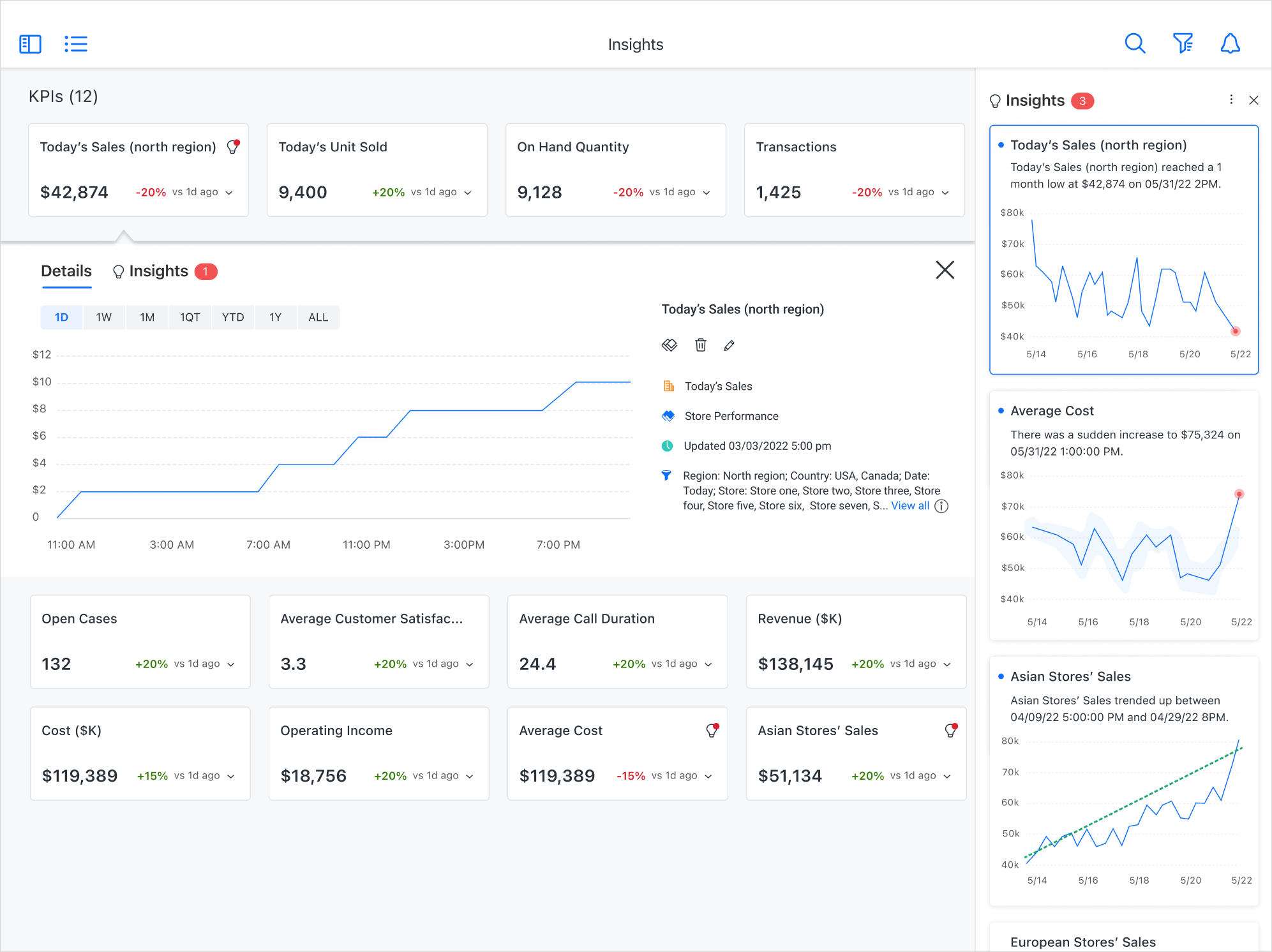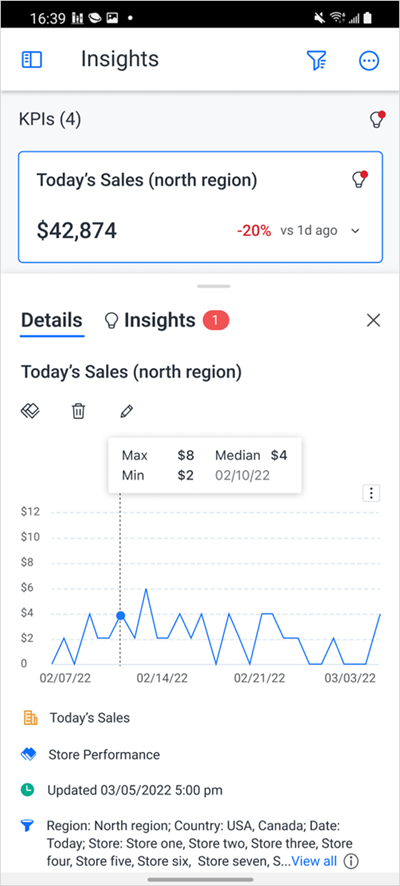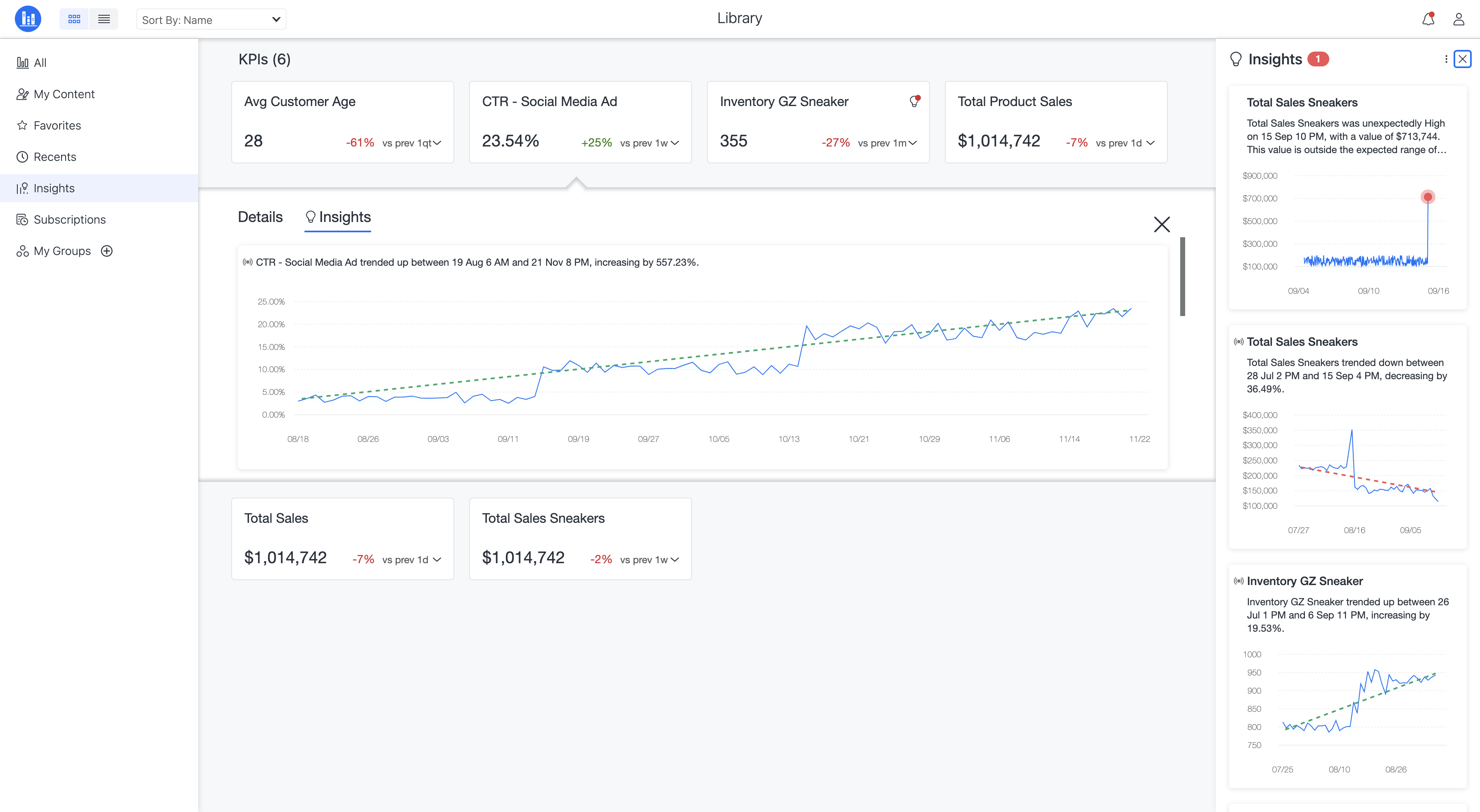 인사이트는 사용자가 추적하는 KPI를 기반으로 추세 및 이상값에 기반한 인사이트를 검색하는 데 도움을 줍니다. 새로운 인사이트가 발견되면 이메일 알림 및 인앱 알림으로 사용자에게 알립니다. 페이지 오른쪽 상단의 전구 아이콘을 사용하거나 탐색 창의 인사이트 섹션을 사용하고 KPI를 클릭하여 인사이트에 액세스할 수 있습니다. 인사이트 기능은 현재 다음과 같은 인사이트 유형을 표시합니다.