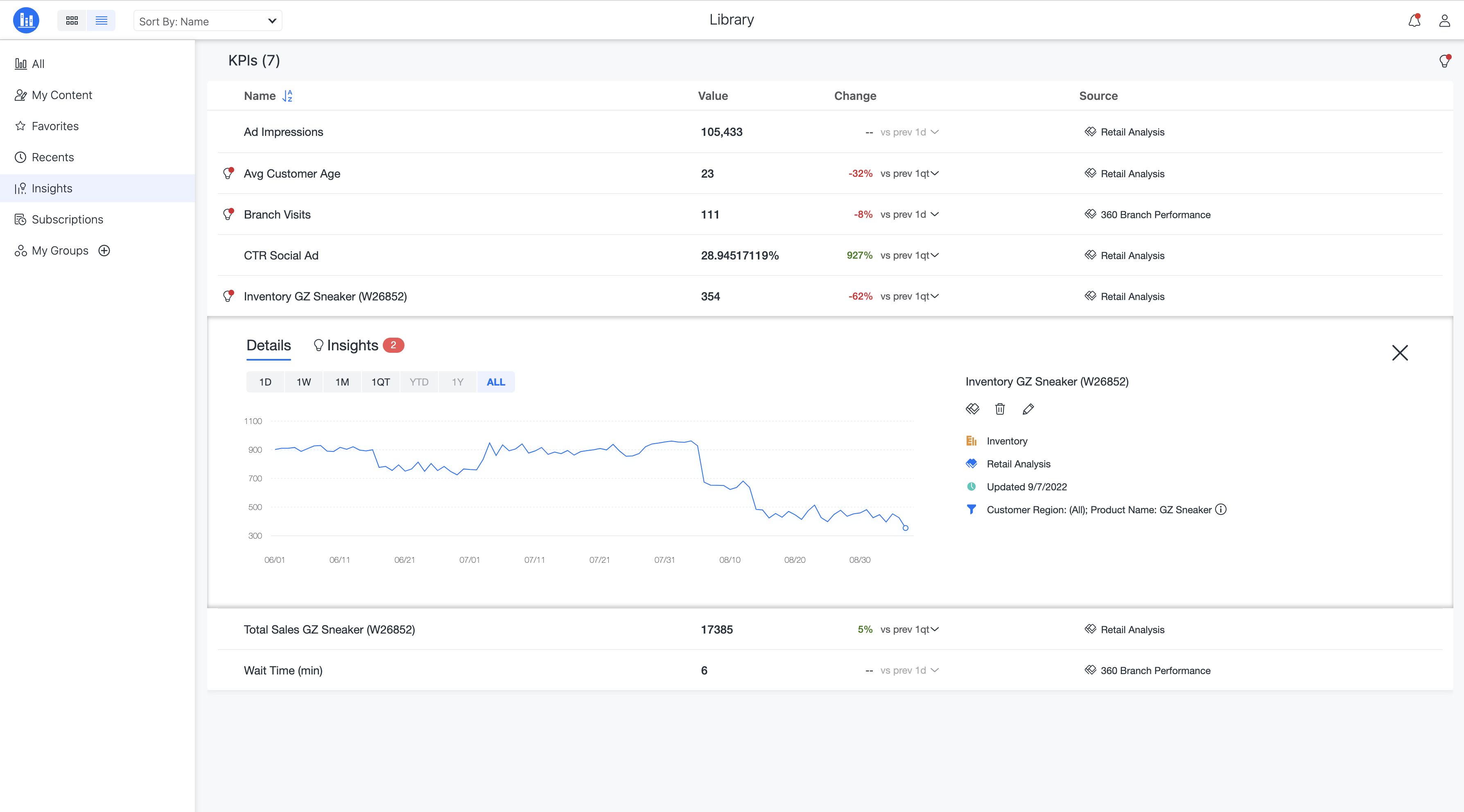 인사이트 페이지에서 KPI를 클릭하여 세부 사항 창을 확장합니다.