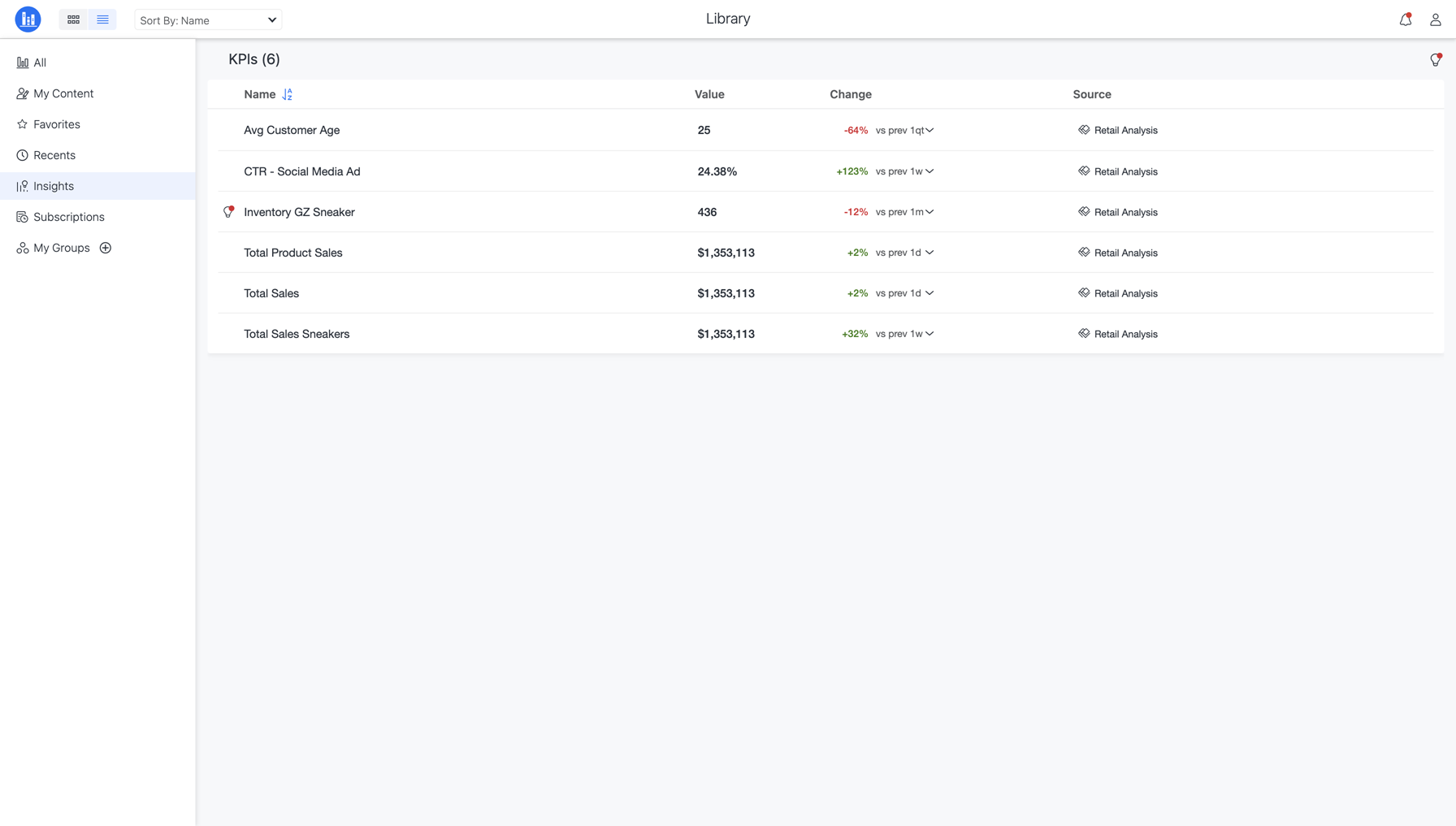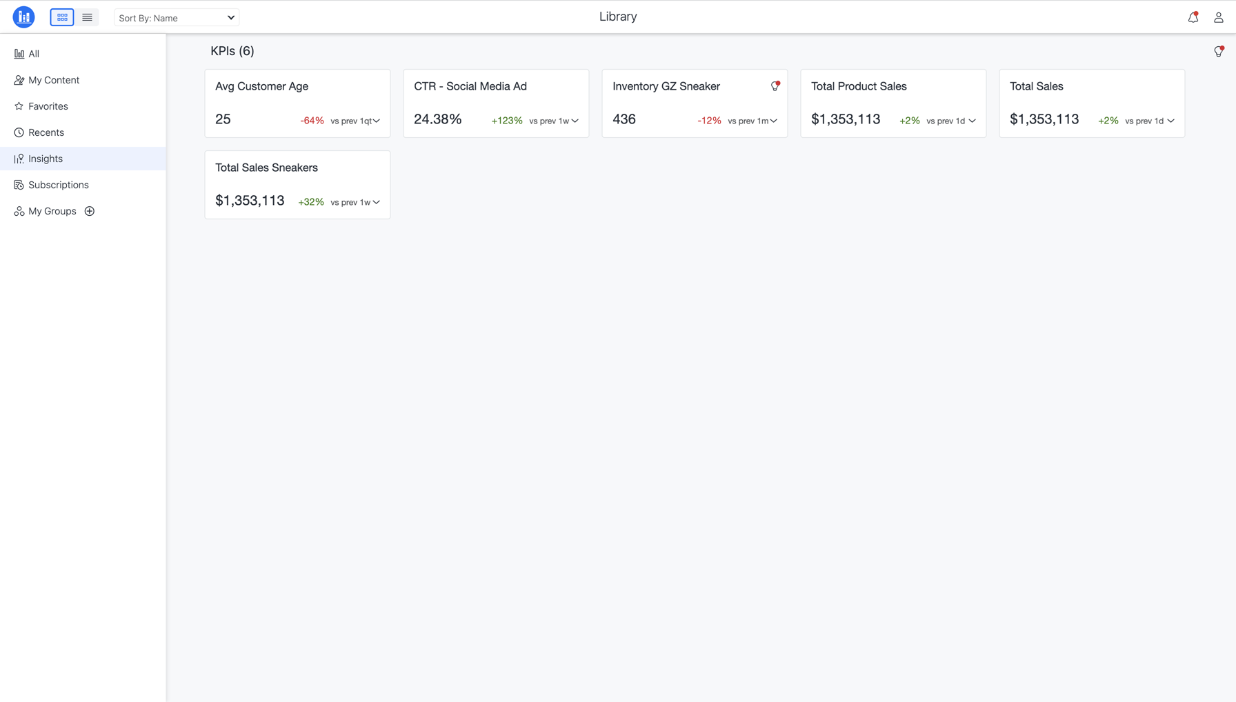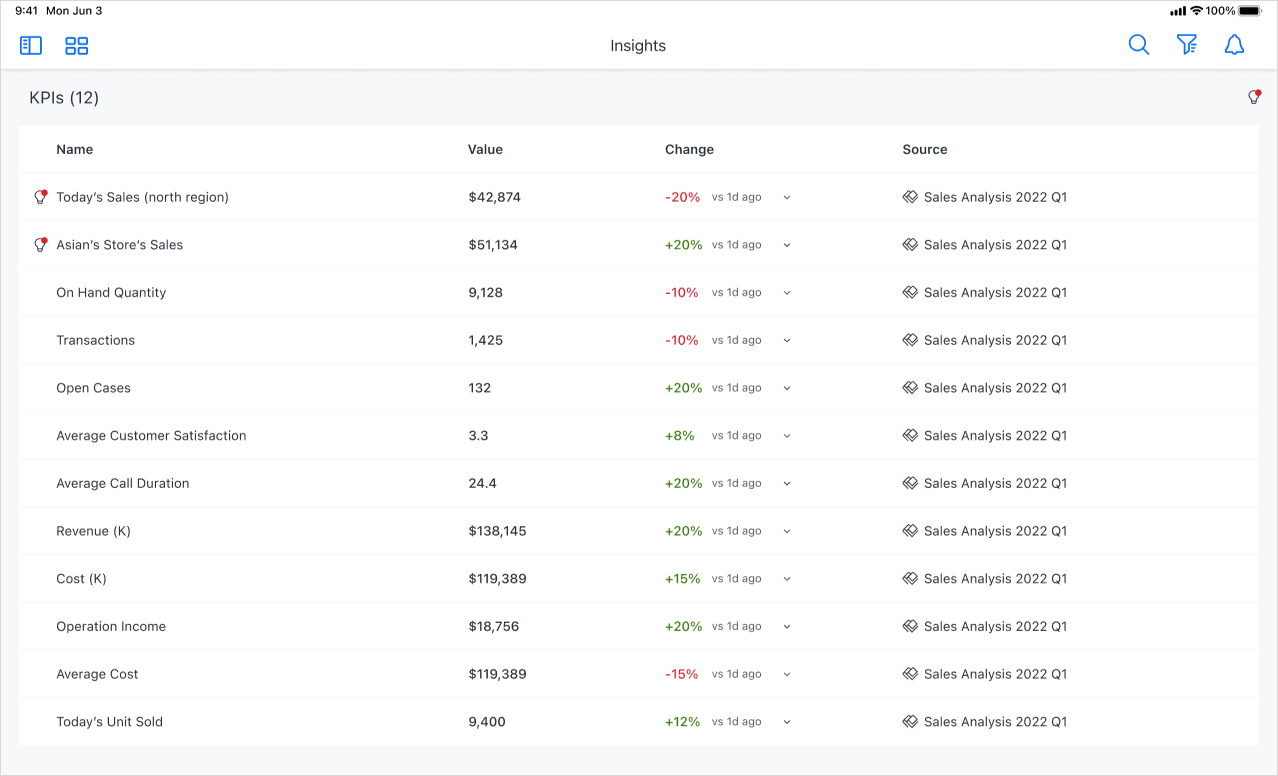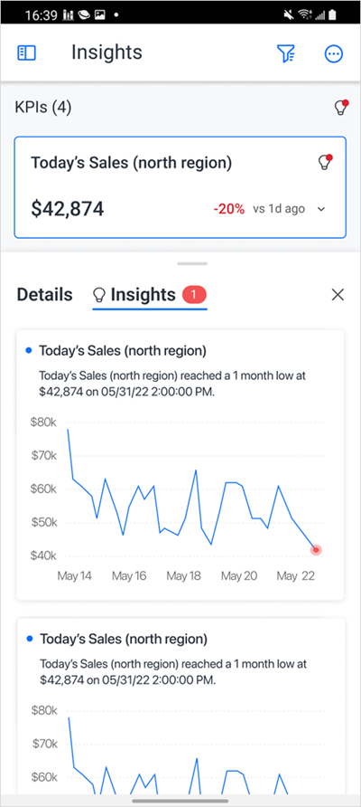 KPI가 인사이트 페이지에 추가되면 (으)로 이동합니다. 인사이트탐색 창에서 을(를) 클릭하여 액세스합니다. KPI는 타일 또는 목록 보기로 한눈에 사용할 수 있습니다. 또한 KPI를 열어 이전 값, 소스 대시보드, 필터 정보 및 원래 KPI가 포함된 대시보드 보기에 대한 빠른 상황별 링크 등의 세부 사항을 볼 수 있습니다. 인사이트 섹션을 사용하여 추세 및 이상값에 따라 추가 인사이트를 볼 수도 있습니다.