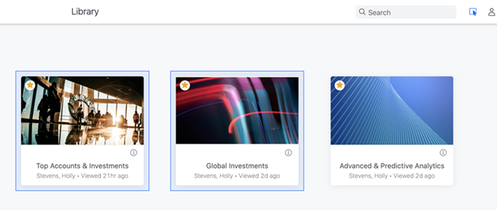 각 타일에서 다음을 확인할 수 있습니다. 이름항목의작성자 , 항목이 이전에마지막 업데이트 또는 본 . 특정 대시보드를 기준으로 관련 콘텐츠를 볼 수도 있습니다.