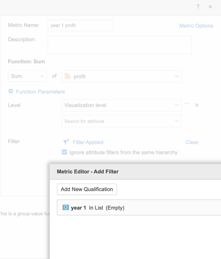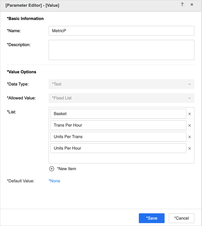 고정 옵션 목록을 제공하는 MetricP라는 값 매개 변수를 정의합니다. 이 목록은 사용 가능한 메트릭 개체 또는 제공하려는 옵션을 기반으로 채워야 합니다. 선택 항목이 특정 메트릭 개체로 제한되지 않고 표현식이 될 수 있기 때문입니다. 또한 목록의 각 항목의 표시 문자열이 사용자의 기본 설정에 맞는지 확인합니다.