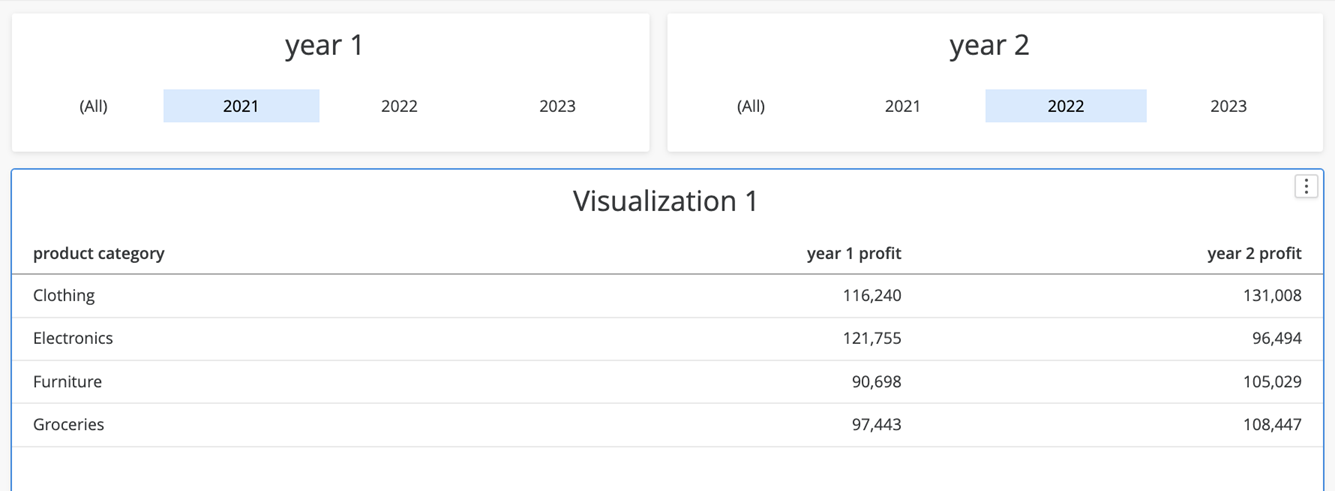 1년 및 2년에 대한 2개의 매개 변수 선택기와 함께 파생 메트릭을 그리드에 추가하여 단일 선택 전용으로 설정합니다. 이제 모든 2년을 나란히 수익을 비교할 수 있습니다.