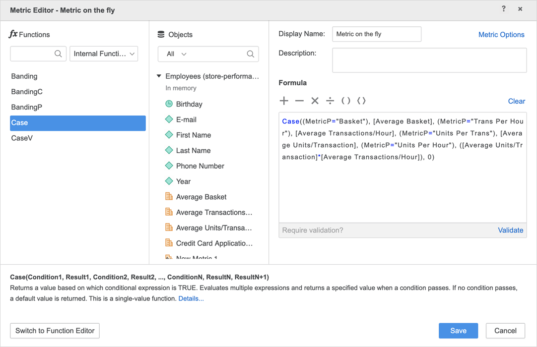 [Average Units/Transaction] *[Average Transactions/Hour]이는 두 메트릭의 곱을 나타냅니다. 호환되는 모든 산술 표현식MicroStrategy여기에서 엔진을 사용할 수 있습니다.