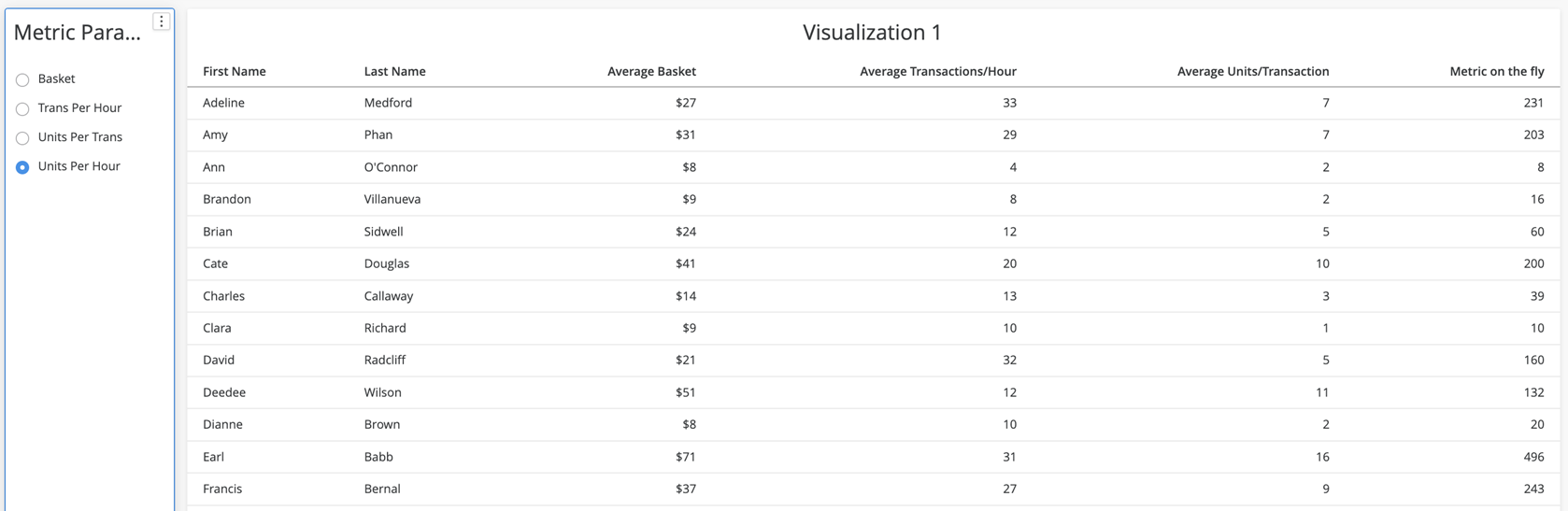 파생 메트릭을 그리드 또는 시각화에 추가하고 새로 생성된 MetricP 매개 변수에 따라 매개 변수 선택기를 설정합니다. 이 선택기는 기본적으로 메트릭 개체 선택기의 기능을 하지만 기능이 향상되었습니다. 예를 들어 MetricP = "시간당 단위"인 경우 새로 생성된 파생 메트릭의 반환 값은 다음과 같습니다.